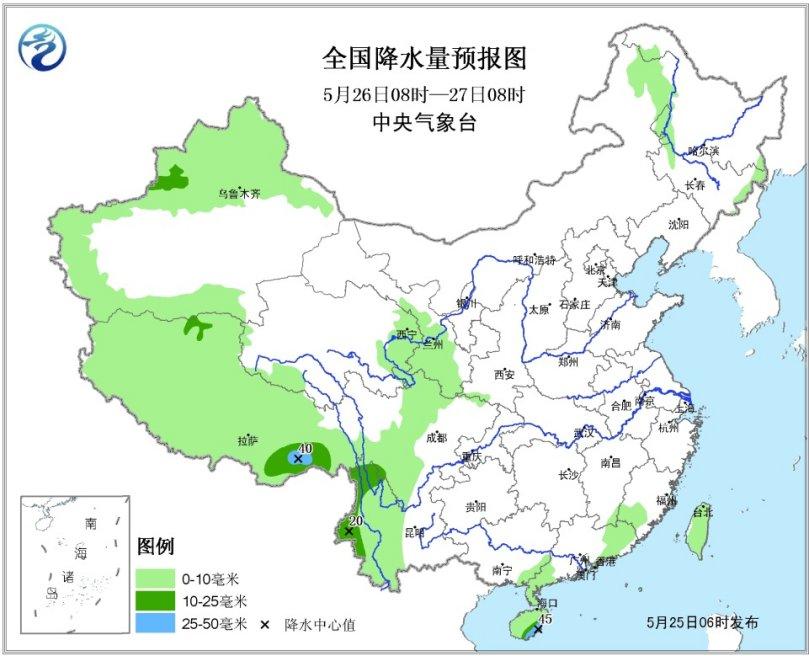 26日08时至27日08时,新疆北部和南疆盆地南部、西藏、青海东北部、甘肃南部、川西高原、云南西部、雷州半岛、海南岛等地有小到中雨,其中西藏东南部、海南岛东南部等地局地有大雨(见图2)。