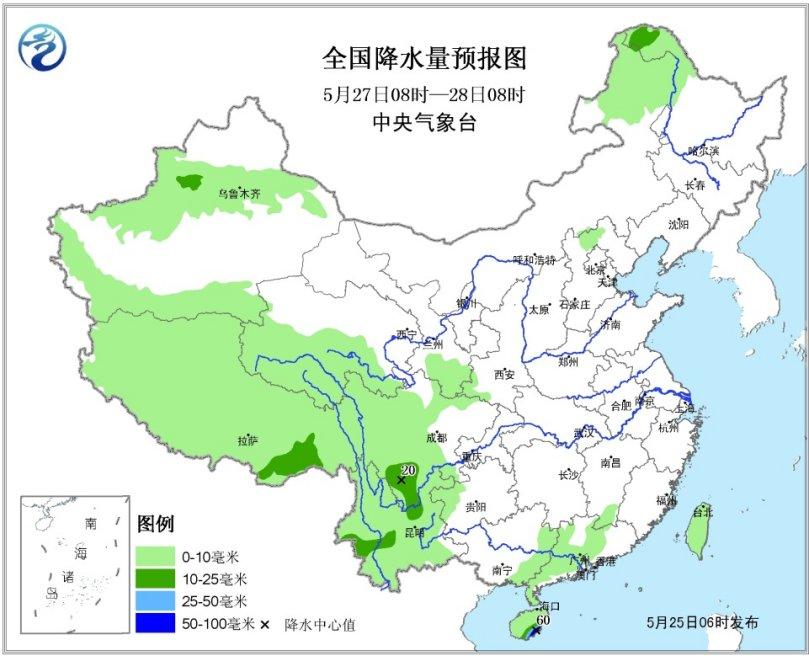 海南岛及云南等地局地有强降水。受低层辐合切变系统影响,预计,25日08时至26日08时,云南南部、海南岛南部等地局地有大雨或暴雨(50~90毫米);上述地区局部并伴有短时强降水、雷暴等强对流天气。