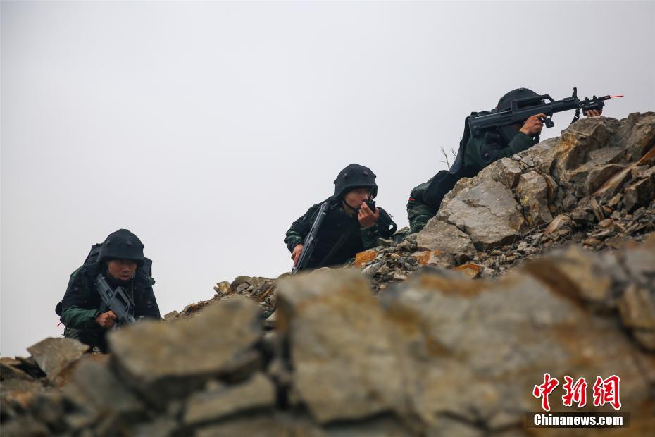 5月24日,官兵们在隐蔽自己准备组织开展红蓝对抗训练。当天,武警浙江总队组织直属、舟山、宁波、台州等四个支队特勤分队在舟山开展第二季度“魔鬼周”极限训练。据悉,此次“魔鬼周”训练设置了武装奔袭、山地越野、荒岛求生、夜间行军和各种枪械射击等课目。中新社记者殷福军 摄