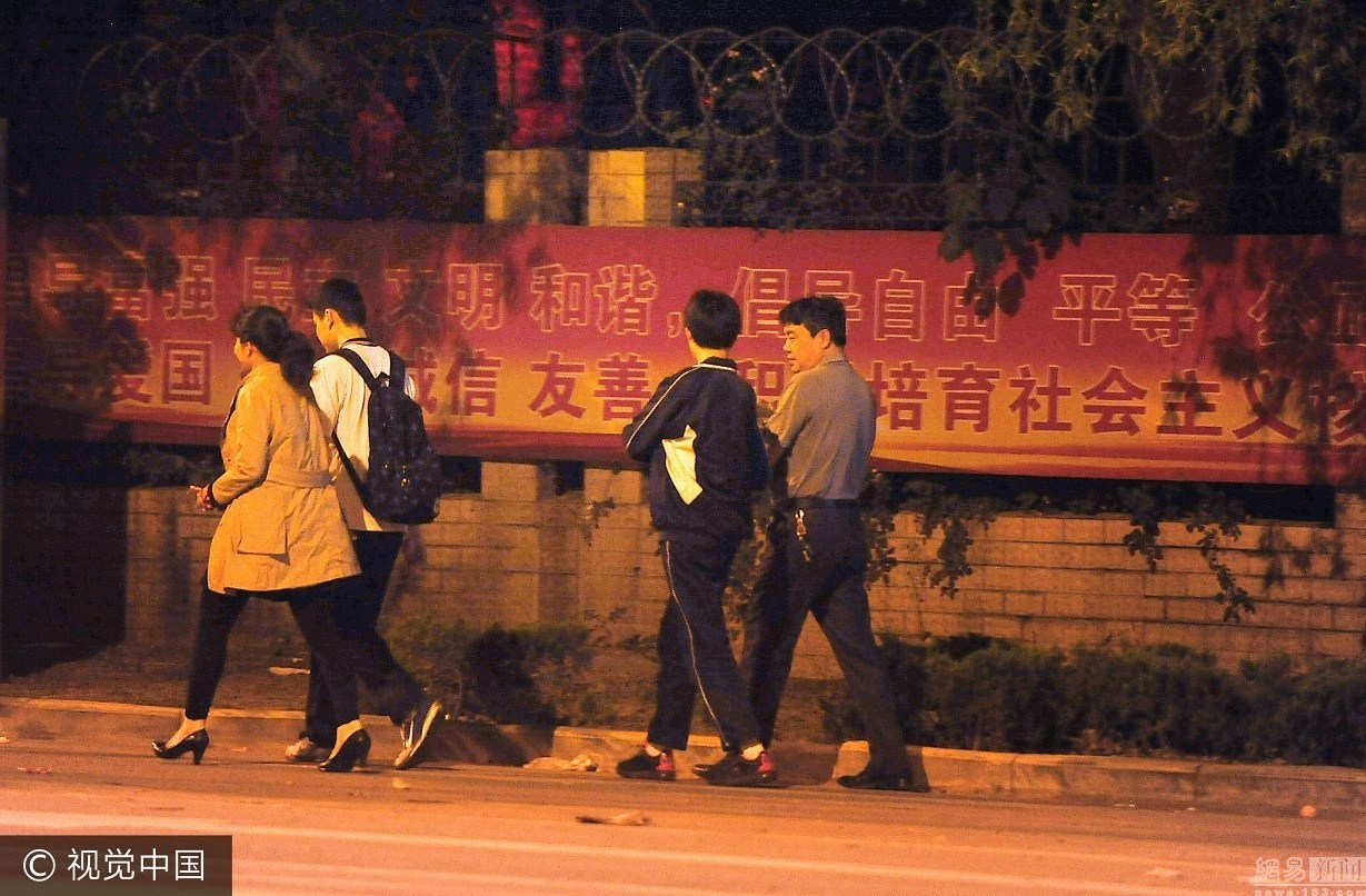 图为家长接孩子下晚自习。图片来源:视觉中国