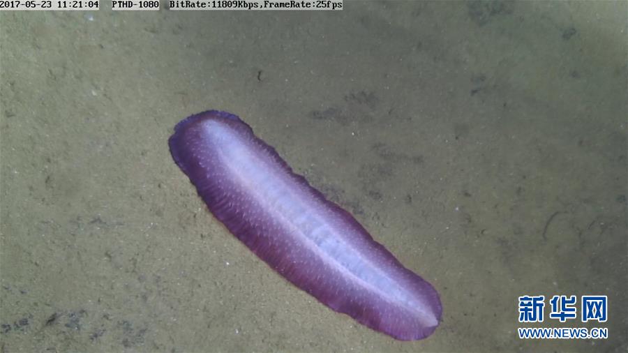 这是5月23日“蛟龙”号在马里亚纳海沟4743米处拍摄的一只超过30公分长的紫色海参。
