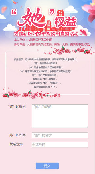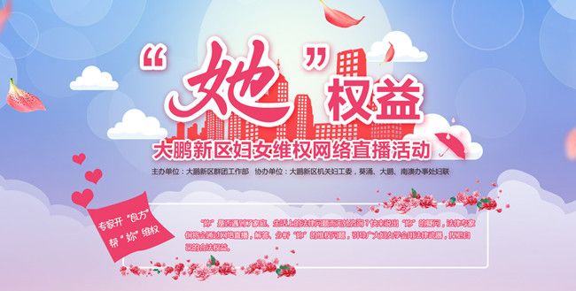 据了解,为深入学习贯彻习近平总书记系列重要讲话精神和中央党的群团工作会议精神,着力营造家庭和美、社区文明的良好社会氛围,大鹏新区将围绕“巾帼创新业 建功十三五”主题,以“反家暴法”、“男女平等”、“和谐家庭关系”为主题开展3期网络在线直播活动,线上收集辖区妇女关心的法律法规问题,邀请相关法律专家现场解答、分析,引导广大新区妇女学法、尊法、信法、守法、用法,鼓舞、激励和引领新区妇女为“美丽大鹏”建设做出新的更大贡献。