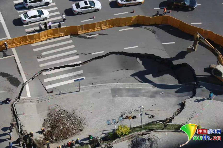 塌陷路段已被施工方用挡板隔开。 记者 李永鹏 实习记者 蒋艳慧 图片来源:中国青年网