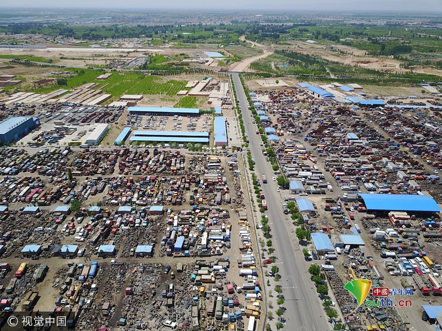 航拍宁夏“汽车墓地” 报废汽车集中停放场面震撼