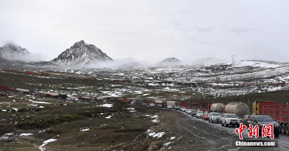 国道318线公路上从新都桥前往康定方向排队上山的车队。刘忠俊 摄