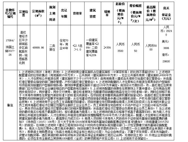 5月17日,珠国土储2017-30号地块挂牌出让模式与上述两幅住宅地块相似。地块同样规定住宅仅能销售给 竞得人及其实际控制人的关联企业员工或香洲区洪湾港及周边区域范围内的企业员工, 员工所购住房自《不动产权证书》颁发之日起10年内不得转让。
