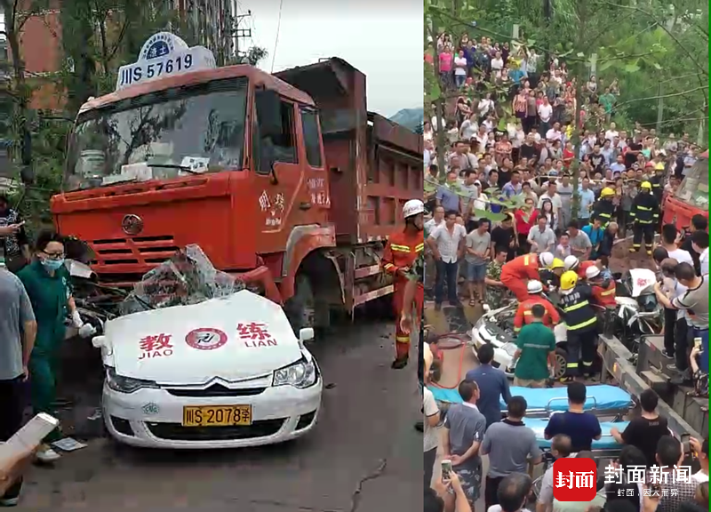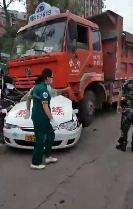 据现场目击者介绍,事发前,涉事的大卡车从坡上往坡下行驶,车速不快且几乎是匀速行驶。大卡车行驶至事发路口时,涉事教练车突然从道路的右侧驶出,大卡车未来得及停下,其前轮最终压上了教练车的车身。