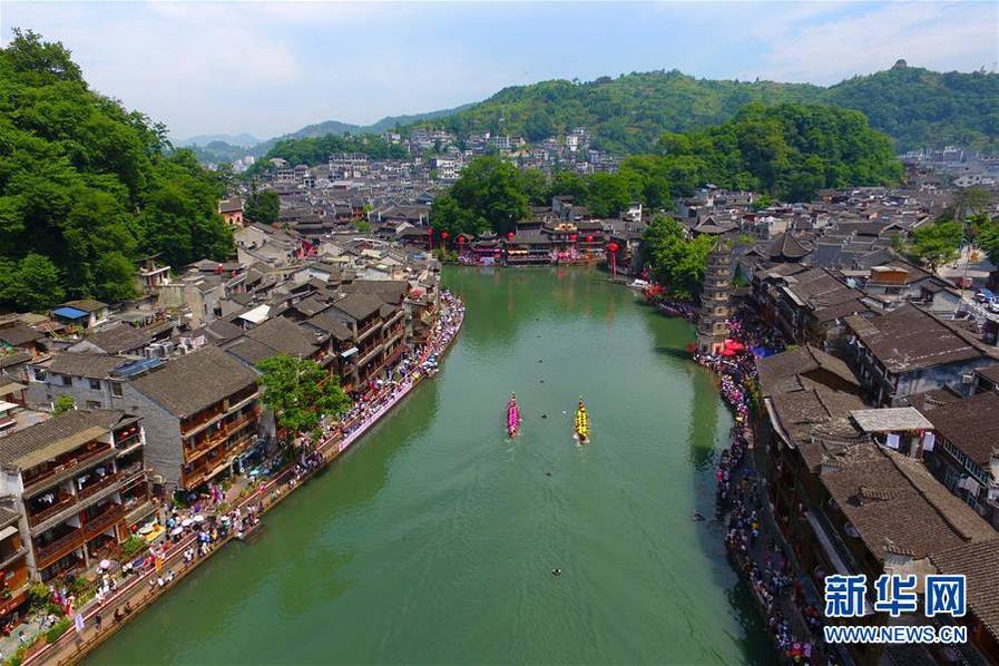 图为29日,两支队伍在凤凰古城沱江上赛龙舟。