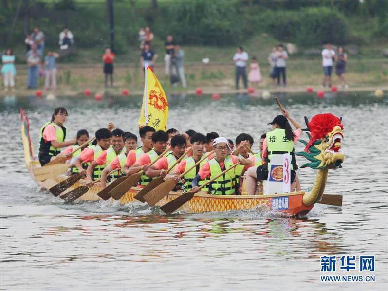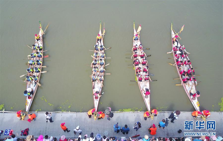 5月30日是端午节,各地群众举行传统民俗活动纪念爱国诗人屈原。图为30日,海南省琼海市博鳌镇的人们在万泉河入海口赛龙舟。图文:新华网