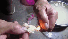 只见一男子将某品牌肉松饼拿水浸泡,之后不停用手揉搓,形成了一团白色絮状物。