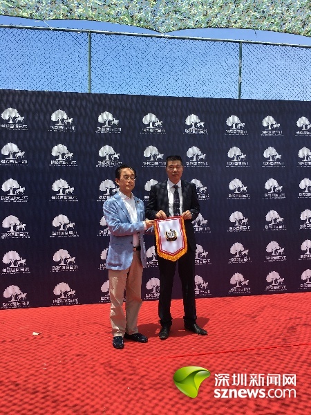 中国马业协会副会长陈泽嘉为瑞欧国际马术俱乐部董事长余喜文颁发认证锦旗
