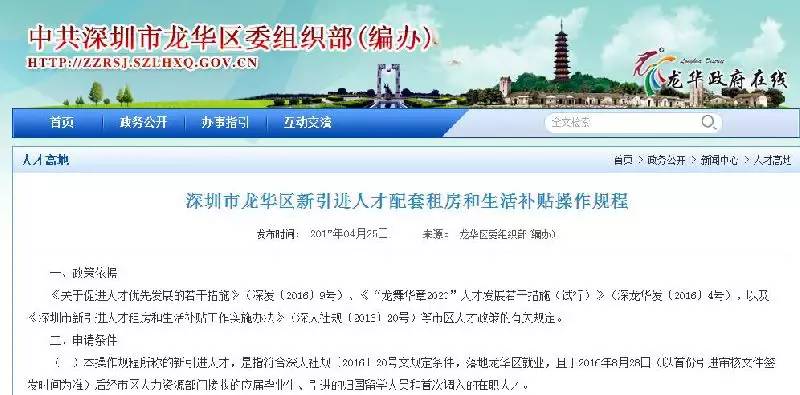 龙华区也发布了新引进人才配套租房和生活补贴操作规程