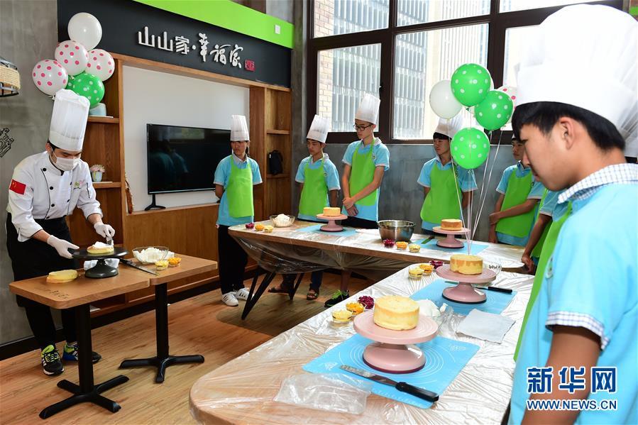 5月31日,在浙江义乌一蛋糕店,来自星光实验学校的听障儿童与糕点师一起手工制作“六一”爱心蛋糕。 新华社发(吕斌摄)
