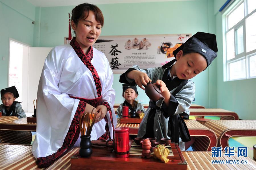 5月31日,湖北省秭归县九里幼儿园的小朋友在迎“六一”茶艺主题活动中动手实践,体验茶文化。 新华社发(王辉富 摄)