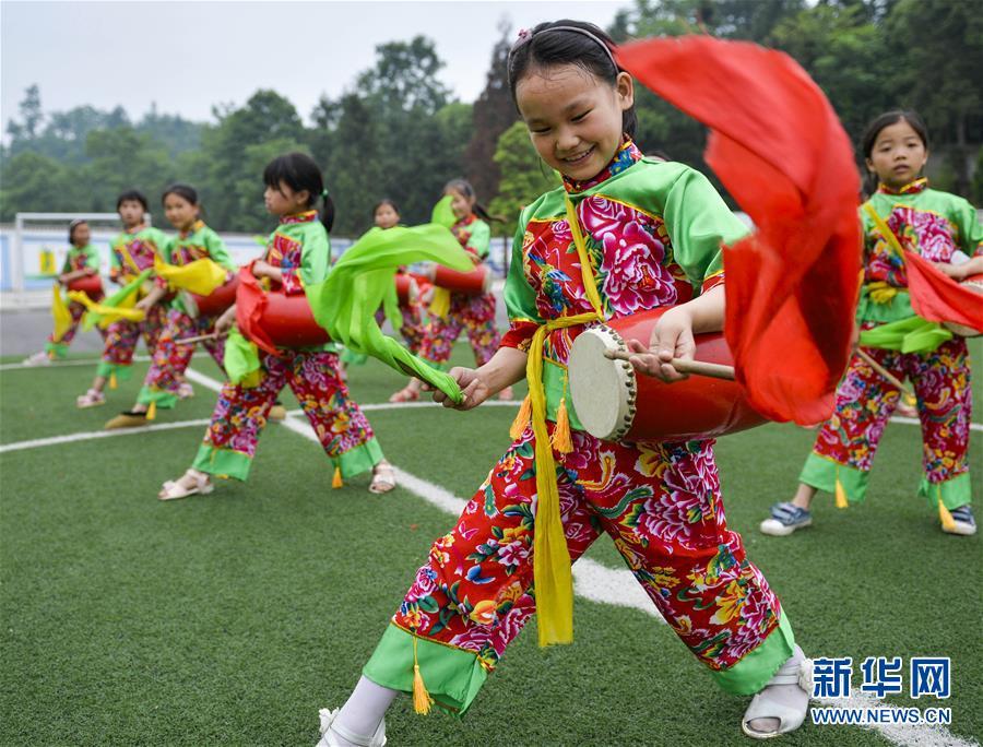 5月31日,贵州省铜仁市松桃苗族自治县盘石镇民族小学的孩子在表演腰鼓舞。当日,贵州省铜仁市松桃苗族自治县盘石镇民族小学的学生表演敲花鼓、打腰鼓、民族舞等特色民族文化节目,喜迎“六一”儿童节的到来。新华社发(龙元彬摄)