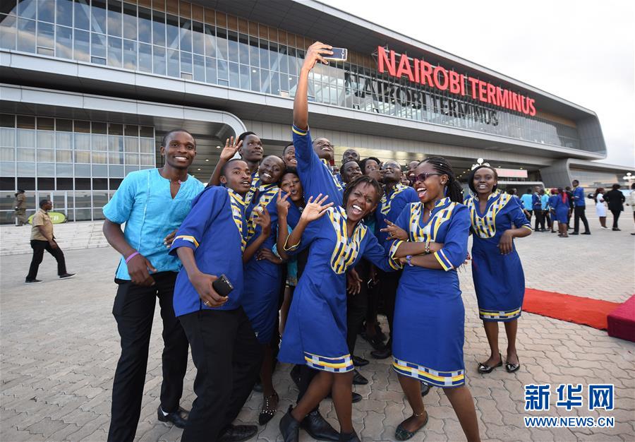 5月31日,在肯尼亚首都内罗毕的蒙内铁路内罗毕南站,演员们在车站前合影。