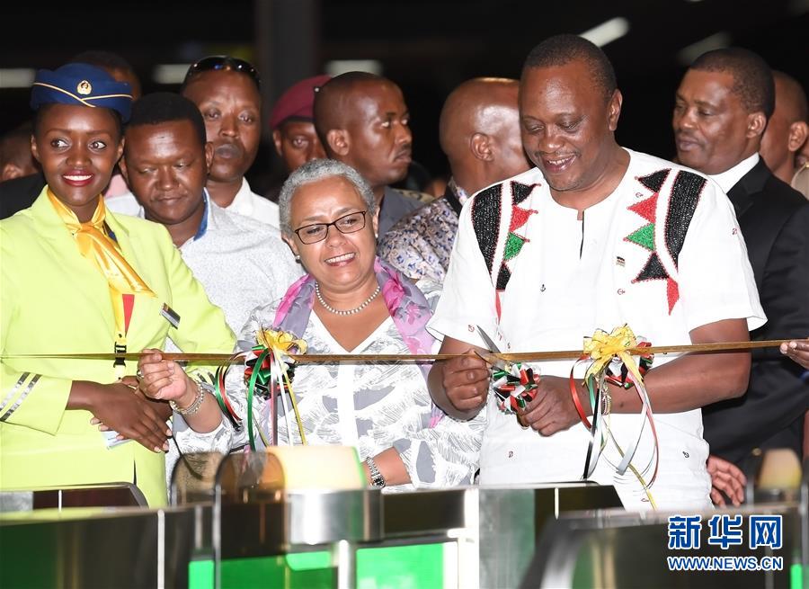 5月31日,在肯尼亚首都内罗毕,肯尼亚总统肯雅塔(前右)参加蒙内铁路内罗毕南站的剪彩仪式。