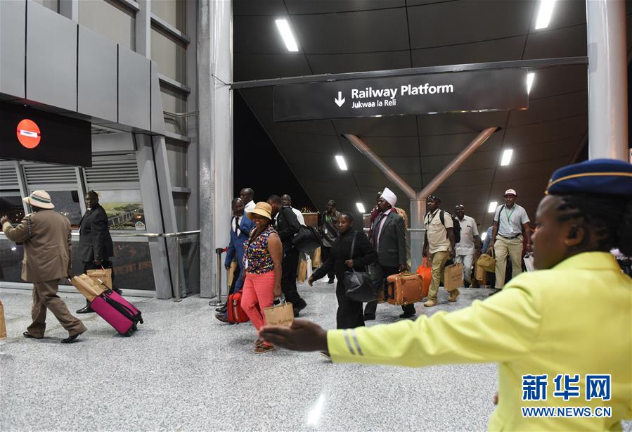 5月31日,在肯尼亚首都内罗毕的蒙内铁路内罗毕南站,工作人员引导乘坐首班列车的乘客走出车站。