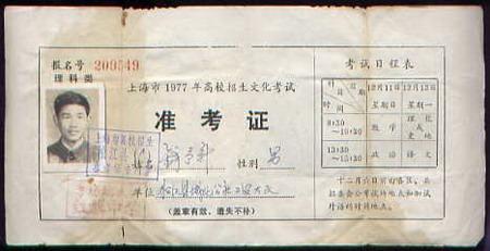 1977年上海准考证正面。