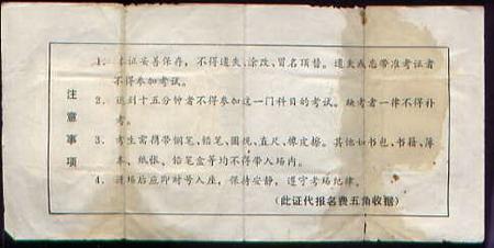1977年上海准考证背面。