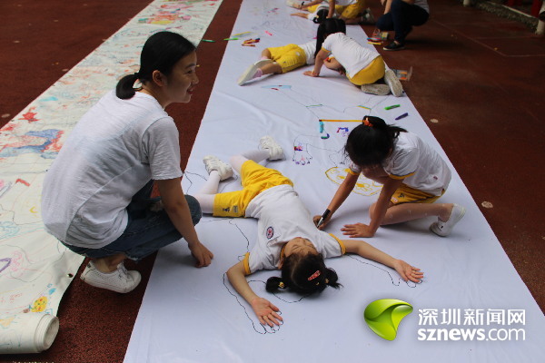 王强一行来到教育幼儿园时,大班的小朋友们正在园内玩各种游戏,其中大三班的小朋友正长幅画布上进行艺术创意画展。见到有的小朋友躺在画布上,让同学画出身形。“小朋友,节日快乐,你在画什么呀?”王强区长马上蹲下来和一位小朋友打招呼,当得知她在进行创意画画后,王强马上伸出左手放在画布上,让小朋友进行创画绘画。这名小朋友马上拿着画笔,将王强的手形绘了下来。练聪和刘根平,也纷纷和身旁的小朋友一起绘画。大家一边画画,一边兴致勃勃地和小朋友们聊天。