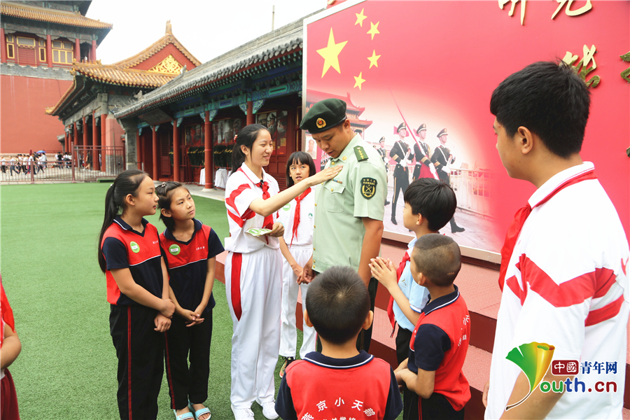 2.泓燕环保公益团队创办人李鸿燕给国旗护卫队指导员彭凯张贴队标 中国青年网通讯员李超 摄