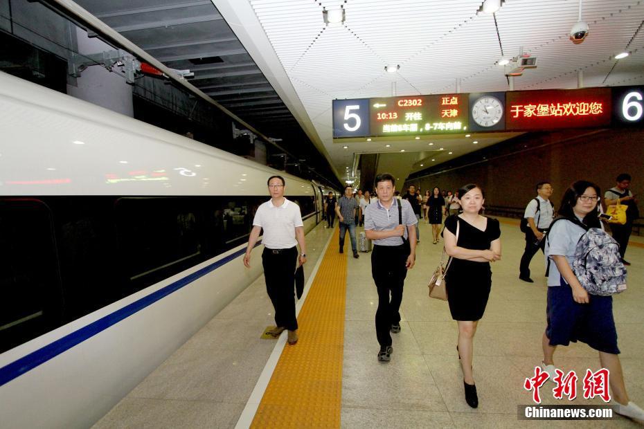 6月1日,一辆京津城际列车抵达天津于家堡站,旅客出站。于家堡高铁站于2015年9月20日正式通车,标志着北京-天津-滨海新区快速通道的打通。中新社记者 张道正 摄