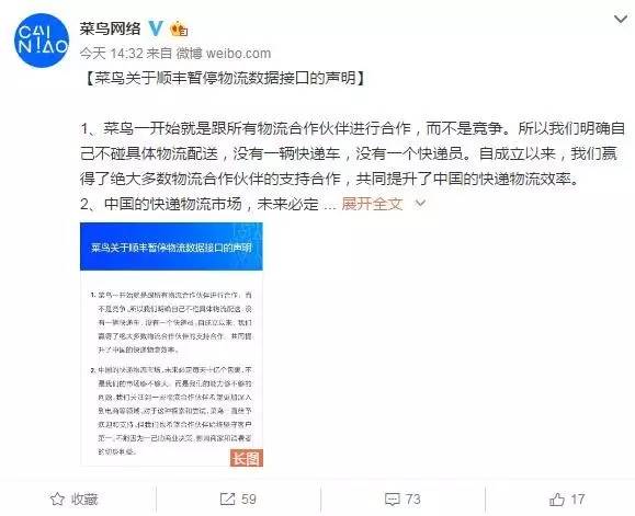 【菜鸟关于顺丰暂停物流数据接口的声明】