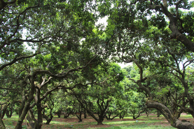 记者走访月亮湾公园的荔枝园发现,园内的荔枝树大多高大葱郁,枝繁叶茂,有别于其它果场一排排整齐密集的荔枝树,月亮湾公园荔枝园内的荔枝树分布大多是稀疏而错落的。