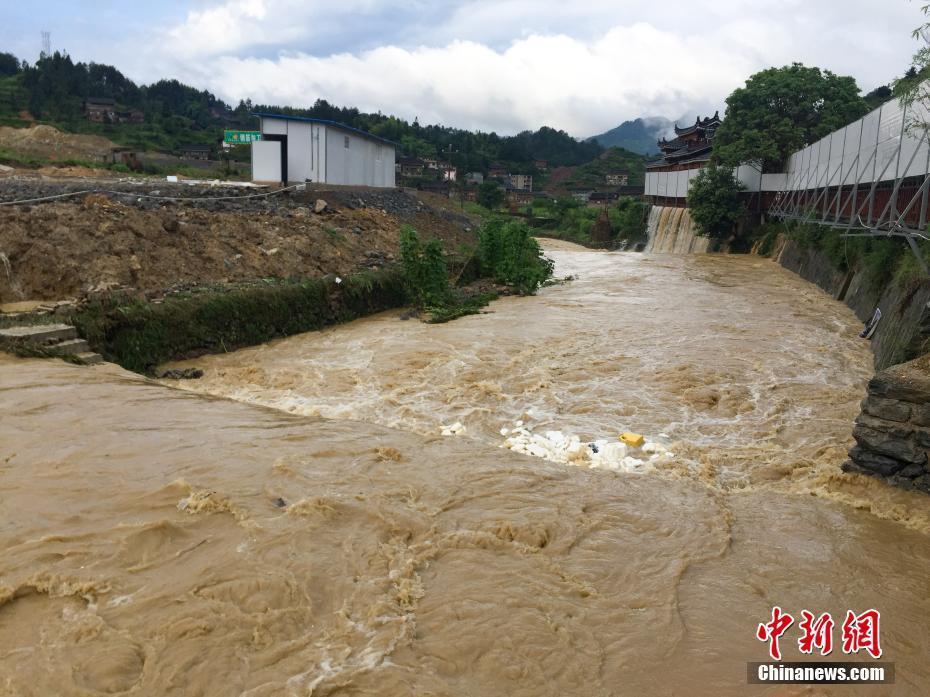 雷山县丹江河河岸淹没,民众手持木棍过河。