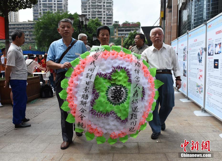 重庆大轰炸幸存者在“六五大隧道惨案”遗址前敬献花圈。 周毅 摄