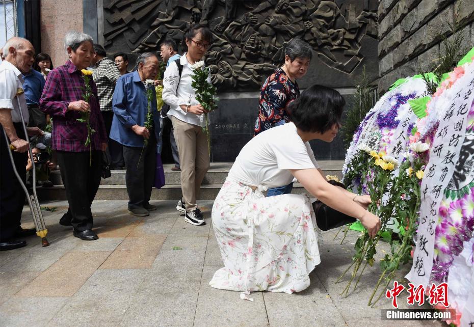 重庆大轰炸幸存者及市民在“六五大隧道惨案”遗址前敬献鲜花。 周毅 摄