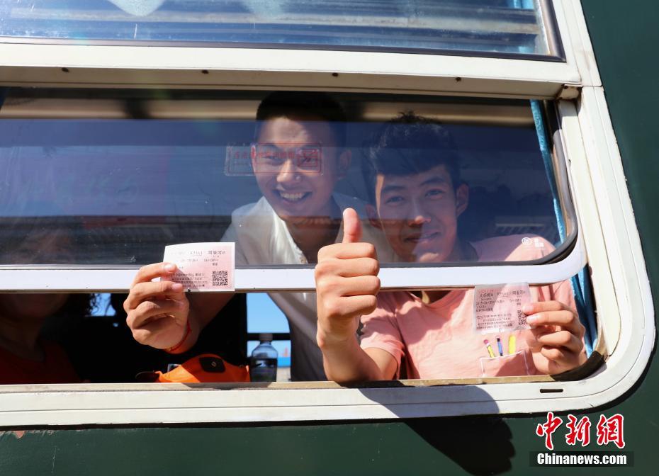 6月5日,乘坐“高考专列”的学生展示车票。当天,在地处大兴安岭南麓的内蒙古鄂伦春自治旗大杨树镇车站,500余名准备参加2017年高考的学生乘坐“高考专列”,穿越山区前往135公里外的旗(县)中心考点阿里河镇。该地区是鄂伦春、达斡尔、鄂温克等北方少数民族聚居区,这列在两个小镇之间开行15年的“高考专列”,已累计运送了2万多名考生,让6000多名学子实现了大学梦。中新社记者王舒 摄