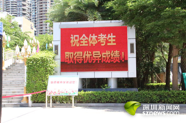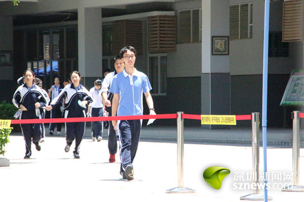 华侨城中学深圳湾部的老师身穿红衣引接刚刚走出考场的考生们。