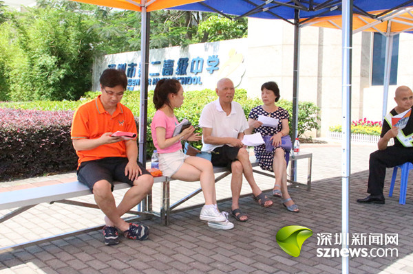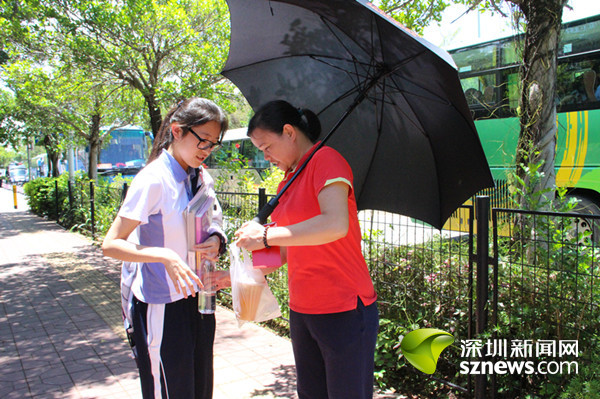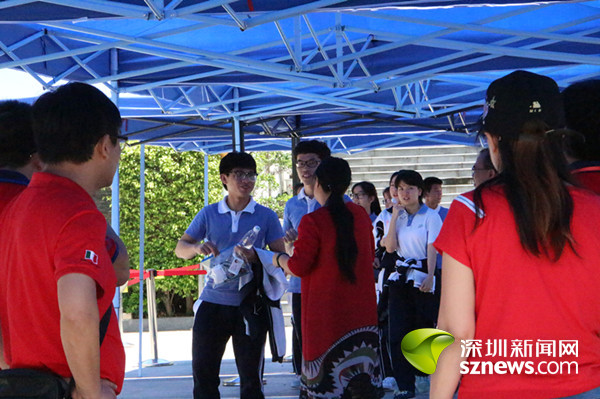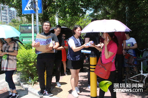 在华侨城中学深圳湾部考点外,有爱心企业志愿者为家长们派发免费的饮用水和扇子。