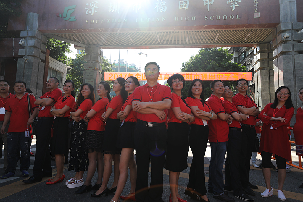 考生全部进入考场后,送考老师聚在一起合影,他们身着红衣,希望考生们“开门红”,考出好成绩。