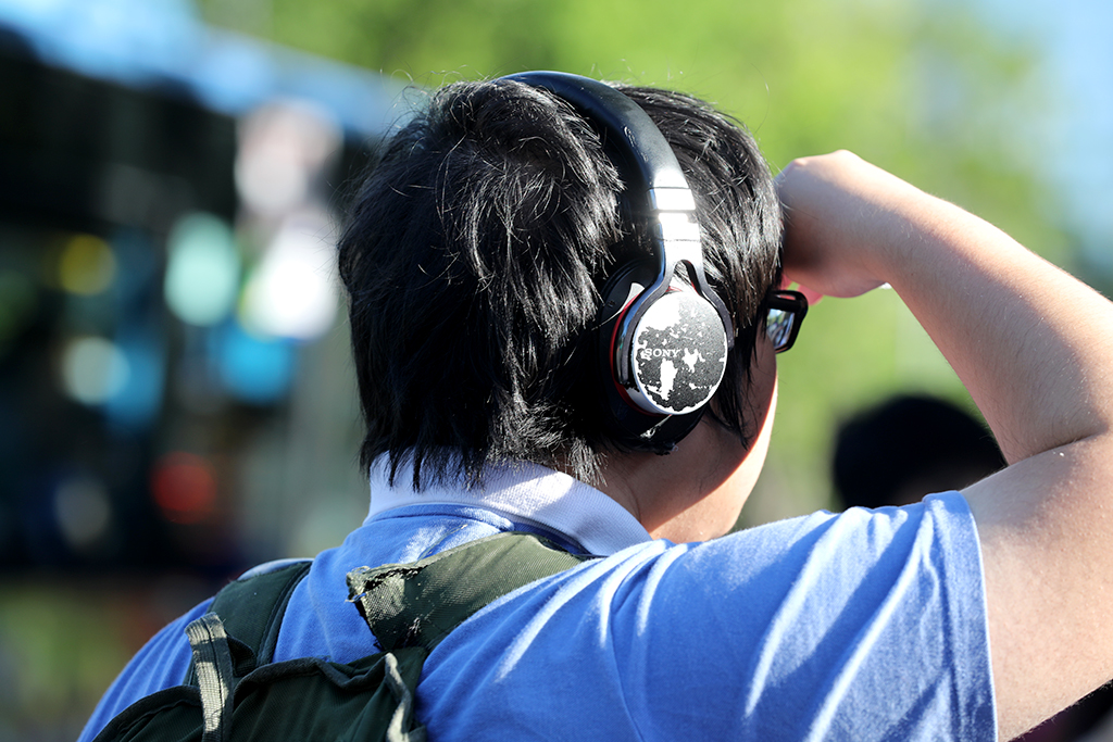 天气很热,阳光灼灼,考生戴着耳机舒缓考前的紧张情绪。
