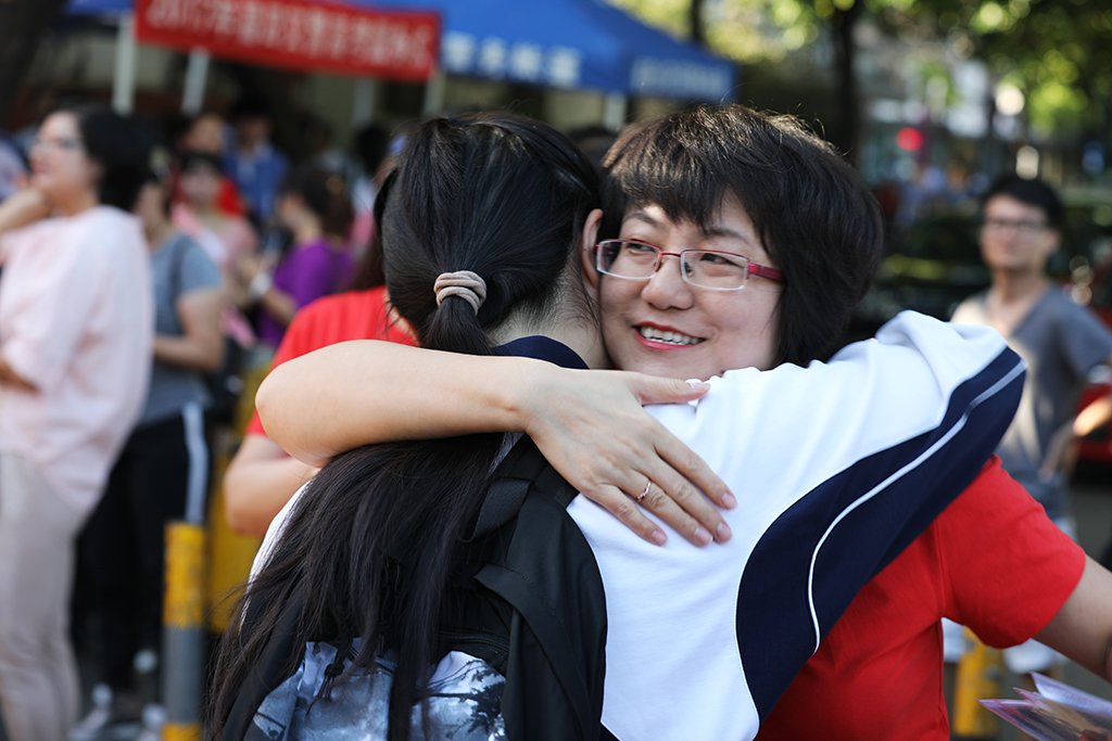 一位送考老师鼓励学生并与考生拥抱,画面温馨动人。