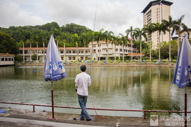 几年前西丽湖有很多钓鱼点,然而为了保护西丽水库,靠近水库的另一边湖被无法翻越的铁丝网给封掉了,现在只剩下这片小小的鱼塘。