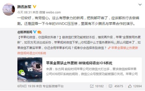 对于网上“苹果‘全面禁用热更新’,如双方无法达成妥协,苹果或将微信下架”消息,腾讯公关总监张军上午在其认证微博转发相关微博时表示,“一切安好,有劳挂心。这么有想象力的新闻,把我都吓着了,应该都改行去做编剧。”