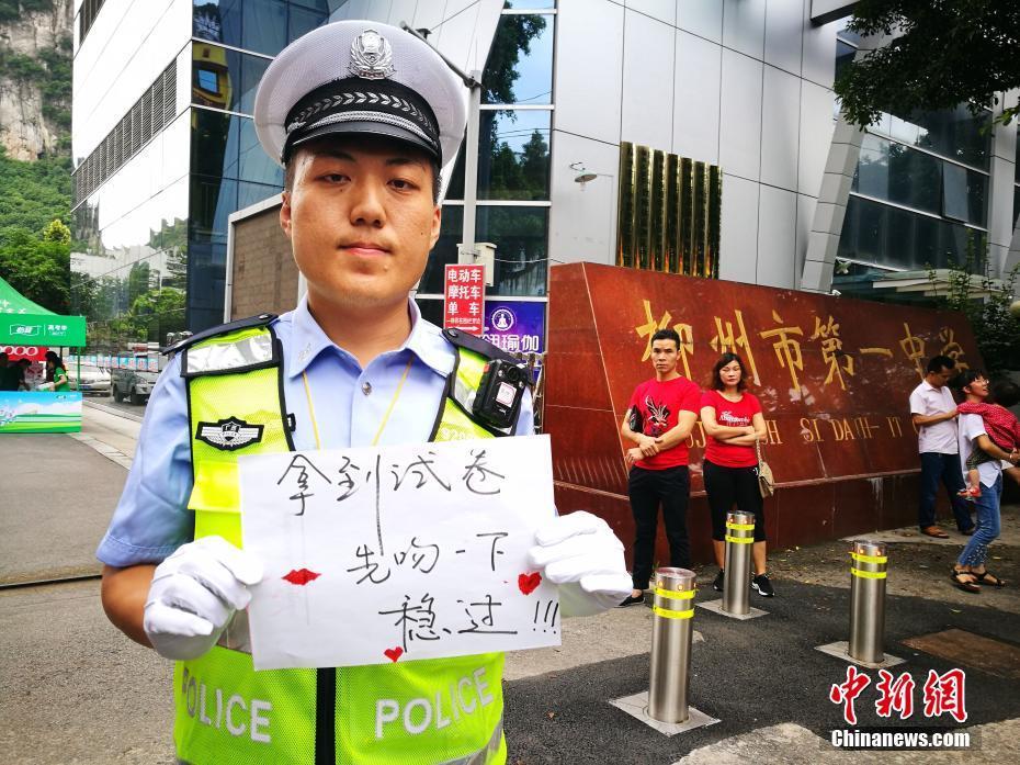 6月7日上午,全国普通高等学校招生统一考试正式开始。在广西柳州市第一中学考点前,数名值勤交警手举写有祝福话语的牌子为考生加油,称“希望背的都考、考的都会、蒙的都对。”2017年,广西普通高考报名人数达36.5万余人,较上年增加3.3万余人。图为交警手举写有“拿到考卷,先吻一下,稳过。”的牌子为考生祝福。李璐 摄