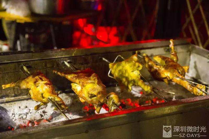 百香果树下有一墙角,靠近竹园后门,大哥正烤着自家店养的土鸡,用的是荔枝木炭,香气扑鼻。