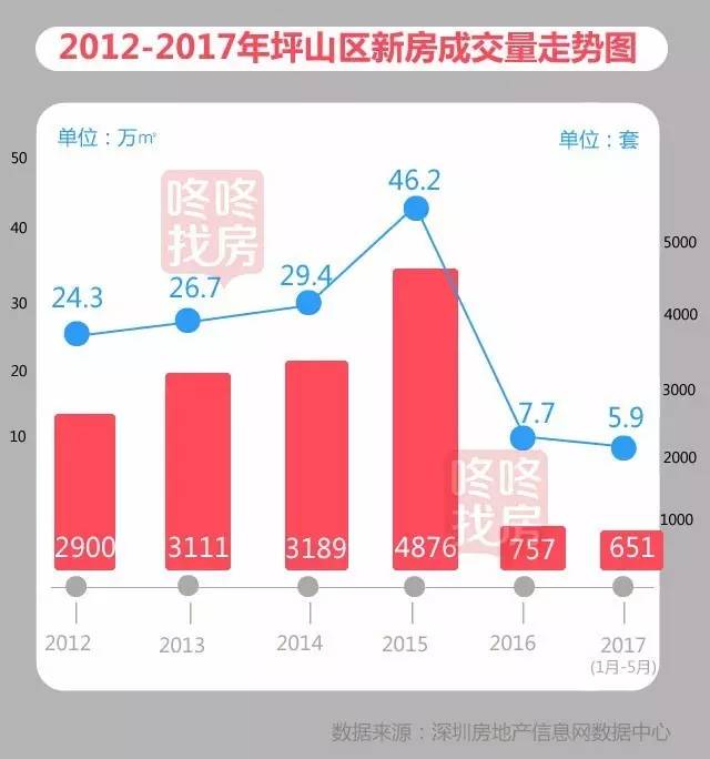 2015年,随着全市房地产市场的火爆,越来越多的人把眼光转向价值洼地坪山区,2015年坪山区成交量激增,全年成交量达46万平方米/4876套,价格也开始飞速上涨。