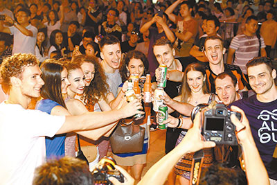 Revelers at a beer festival, which opened at the Window of the World theme park in Nanshan District in Shenzhen on Saturday night. The festival will last until Sept. 10.