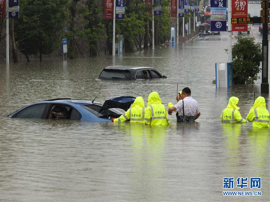 6月12日,贵阳市孟关汽车贸易城路段积水严重,工作人员对被困车辆进行施救。