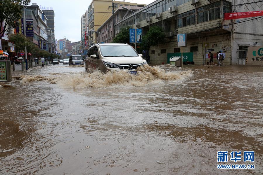 6月11日,汽车在贵州省威宁县城积水路段行驶。