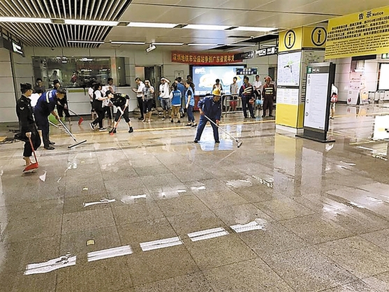 昨日,工作人员将地铁车公庙站积水清理干净。