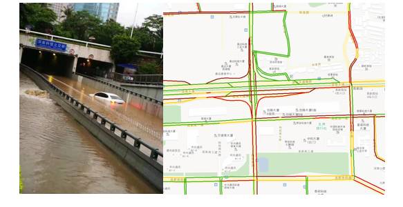 (2)深南科技立交桥(科技路南行方向):通过下游的流量为零,智能识别该地点为积水点。