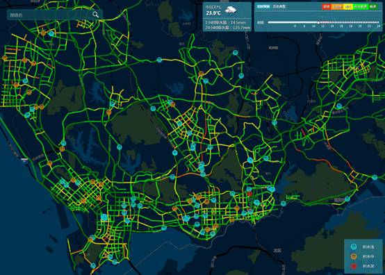 基于降雨、历史交通运行的关联性挖掘,构建智能道路积水识别和预测预警系统(系统正试运行)。系统通过对道路积水的时间和空间分布特征挖掘、积水对交通运行的影响分析,建立基于贝叶斯方法的道路积水智能识别模型,并通过统计模型根据积水发生的频率、持续的时间和影响的空间范围进行分类,标识易涝点(积水点)分布;同时对道路交通和天气的实时监测与预报,实现易涝点(积水点)的实时动态监测、预测和预警管理。