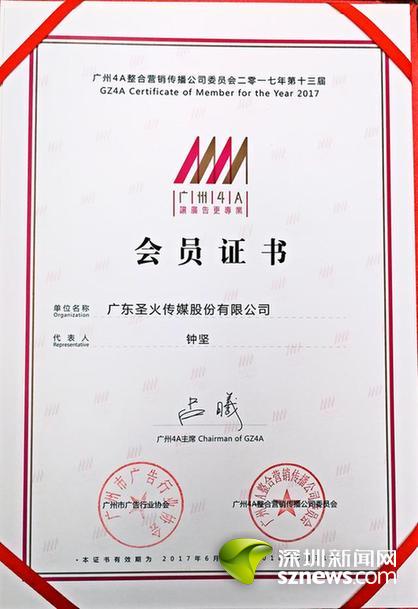 4A被誉为是广告业的“奥斯卡”与“金门槛”,代表着中国广告营销领域的最高水平!它是行业精英的标准,更是一种使命,它引导中国广告行业的方向,是中国广告行业的风向标。成为广州4A协会会员,是圣火股份立足整合营销、践行实效传播的成果,是圣火股份实力的见证。近年来,圣火股份发展迅速、成绩斐然,仅2016年就荣获了国家高新技术企业、广东省高企培育入库企业、广州市优秀企业等诸多殊荣,还成功登陆新三板,并获得新三板最具成长潜力企业奖。